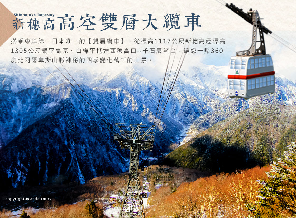 新穗高搭乘東洋第一日本唯一的【雙層纜車】,從標高1117公尺新穗高經標高1305公尺鍋平高原、白樺平抵達標高2156公尺的西穗高口~千石展望台,長達3公里的空中散步,讓您一賭360度北阿爾卑斯山脈神秘的四季變化萬千的山景。冬季山頂、千石園地出現巨大的「雪廊」!高達3公尺!週邊一片雪白的美麗世界,不可思議,請務必到此一遊。