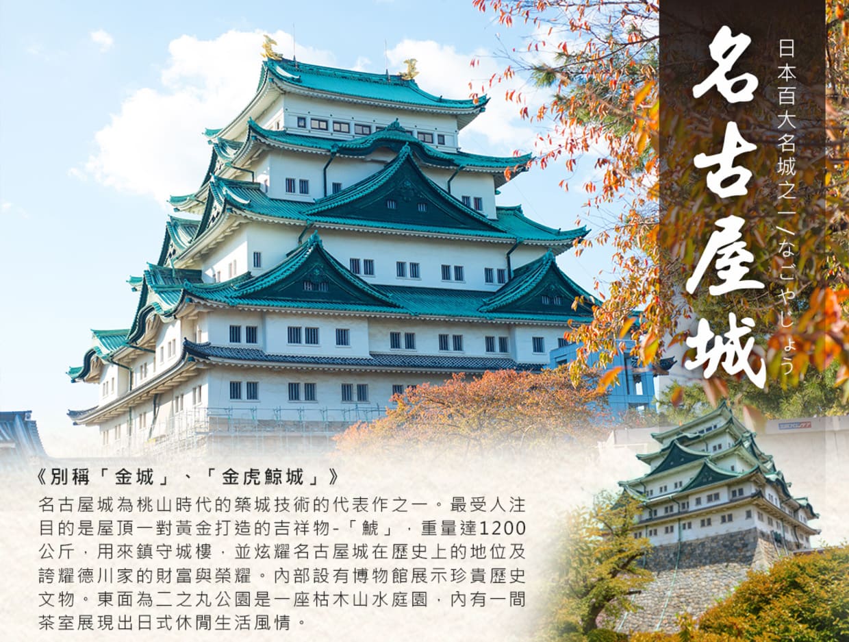 西元1612年(慶長17年)德川家康大抵掌握統治全日本,於是命其兒子德川義直由加藤清正等家臣協助,在名古屋興建造型宏偉的城堡,名古屋城為桃山時代的築城技術的代表作之一。最受人注目的是屋頂一對黃金打造的吉祥物-「鯱」,重量達1200公斤,用來鎮守城樓,並炫耀名古屋城在歷史上的地位及誇耀德川家的財富與榮耀。內部設有博物館展示珍貴歷史文物。東面為二之丸公園是一座枯木山水庭園,內有一間茶室展現出日式休閒生活風情。