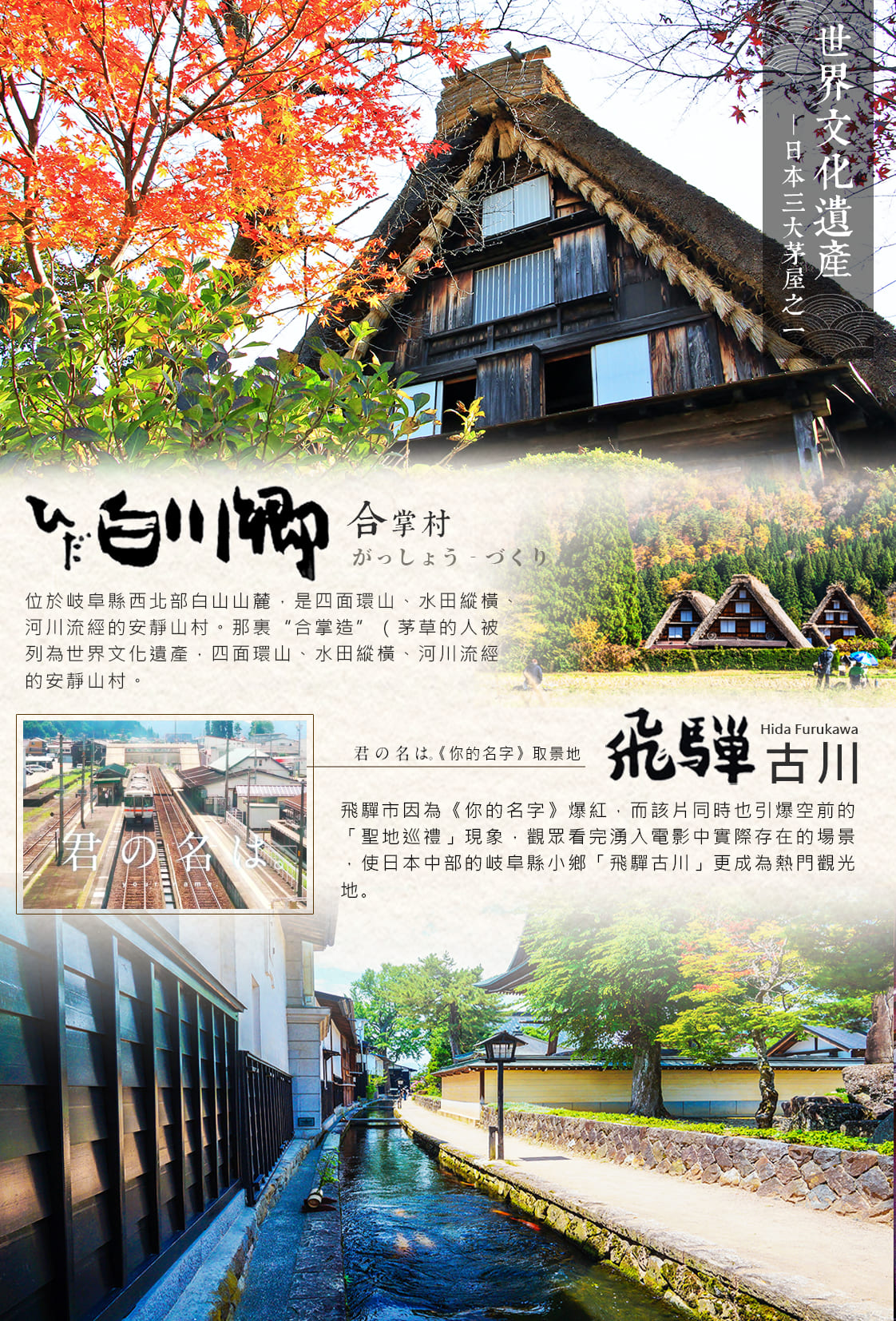 飛驒古川因2016年新海誠的動畫電影「你的名字」而廣為人知。飛驒古川位於岐阜縣,距離高山只有兩個車站,與高山相比,飛驒古川相對面積較小,人氣也較低,逛老城區只需兩三個小時。特別適合想靜靜地漫步在日本老街上、觀察當地工匠大師們的飛驒傳統建築的遊客,在日本飛驒工匠大師被稱為飛驒之匠。儘管飛驒古川的人口只有23,000人,這裡保存了日本的傳統節日、工藝品、飲食文化和手工製品。無論你是否是動畫愛好者,都會愛上這座小鎮的傳統魅力。