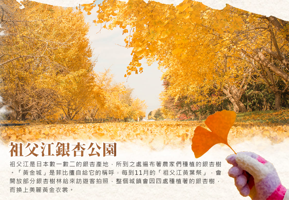 祖父江是日本數一數二的銀杏產地,所到之處遍布著農家們種植的銀杏樹。「黃金城」是菲比擅自給它的稱呼,每到11月的「祖父江黃葉祭」,會開放部分銀杏樹林給來訪遊客拍照,整個城鎮會因四處種植著的銀杏樹,而換上美麗黃金衣裳。而農家們也會把各自的銀杏果擺出來展售,不僅能看還能吃,可以說是當地的熱鬧豐收祭。不過也由於這些銀杏樹所產的銀杏果是當地農家維持生計的重要產物,所以絕對不能任意將掉落的銀杏果帶回去喔。