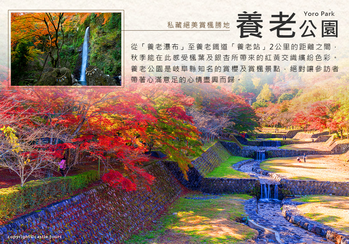 從「養老瀑布」至養老鐵道「養老站」2公里的距離之間,種滿約3000棵的染井吉野櫻、彼岸櫻、八重櫻等眾多品種的櫻花群,春季時分將養老公園染上一抹浪漫粉暈。秋季則能在此感受楓葉及銀杏所帶來的紅黃交織繽紛色彩。養老公園是岐阜縣知名的賞櫻及賞楓景點,絕對讓參訪者帶著心滿意足的心情盡興而歸。