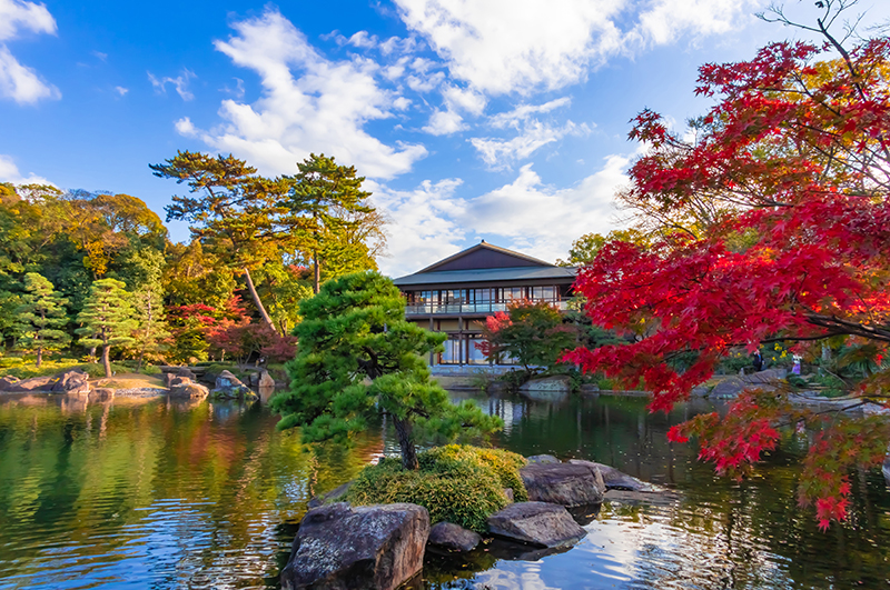 尾張德川家的文化遺產之一。本來是作為德川御三家、尾張藩二代藩主光友的隱居之处於元禄8年(1695)建造的大曽根宅邸舊址。是佔地面積2.3公頃的池泉回遊式日本庭園,地形高低起伏,栽種著很多樹木。用立體假山、大曽根的瀑布、溪流、龍仙湖、牡丹園、菖蒲田代表木曽山脈、木曽三川、伊勢灣、濃尾平野,自然景色、景觀濃縮於大名庭園中。各季有新綠、紅葉以及牡丹、花菖蒲等景觀,秋季可觀賞到伊呂波紅葉、山楓等。植物裝點出的自然美,保留至今。