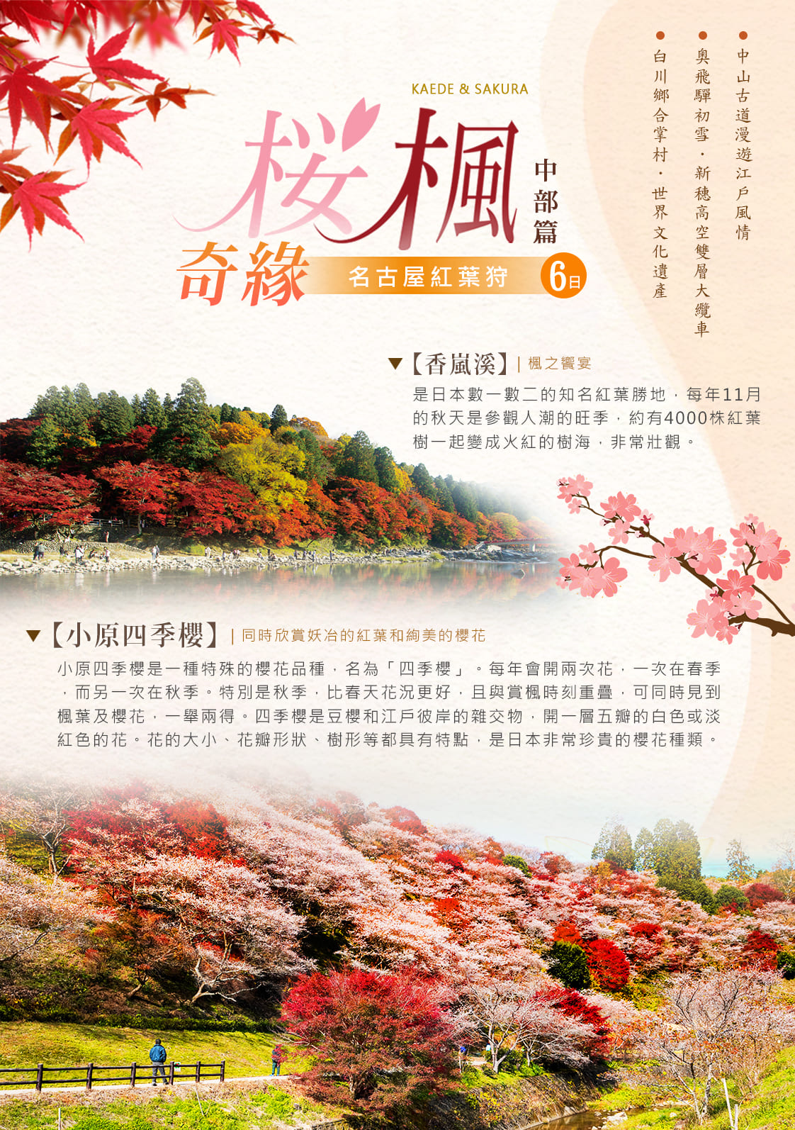 【櫻楓奇緣.中部篇】小原櫻楓・新穗高初雪・香嵐溪楓紅・合掌造遺產・中山古道・名古屋紅葉狩6日