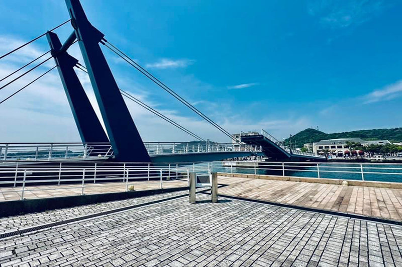 首座日本國內港區行人專用的吊橋。最大特色~當船要過通碼頭區時,兩側橋面會緩緩打開,就像一對翅膀般。藍色的羽翼與一旁的赤煉瓦洋館,在藍與紅的相互映襯下,顯得十分優雅。有機會的話還能欣賞到藍色羽翼翩然揚起的畫面。