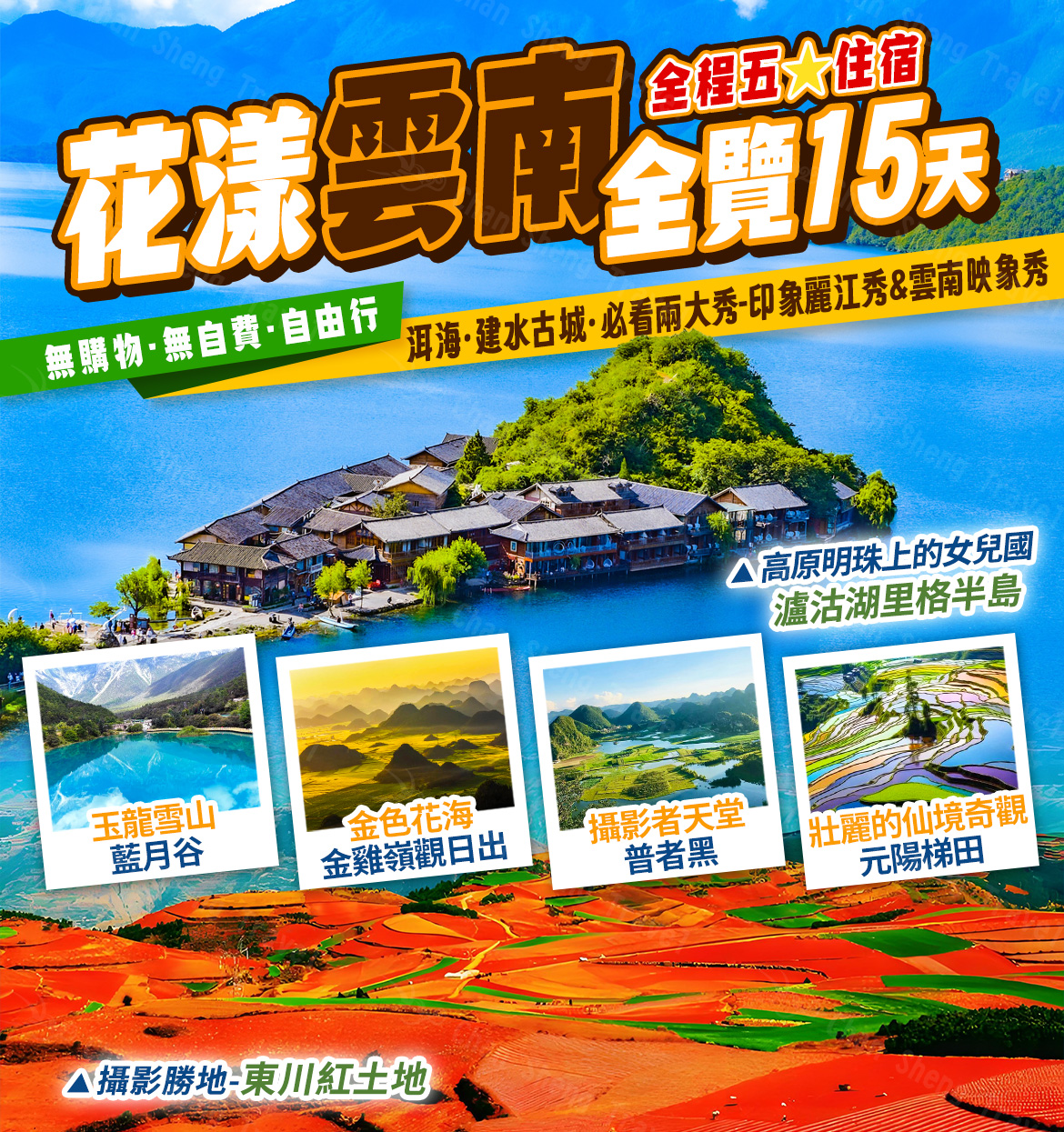2026/03/06(五) | 桃園國際機場出發 【花漾雲南全覽15天】瀘沽湖、麗江、東川紅土地、金色羅平、普者黑、元陽梯田5★住宿酒店高餐標 無購物無自費自由行機位 20 候補0 已售0 可售19因政府政策調整目前中國大陸禁止出團;本行程售價僅提供參考 |