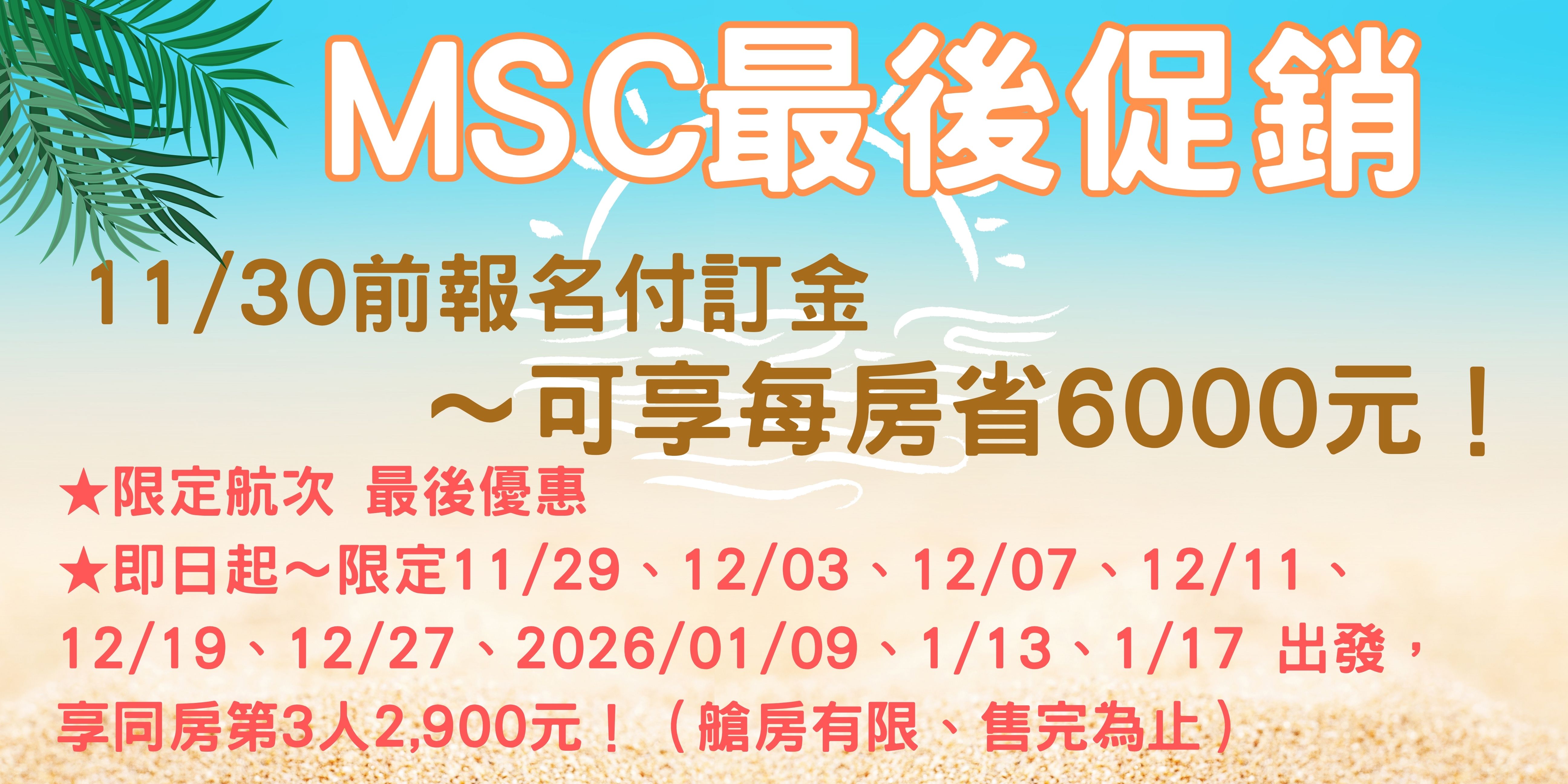【企畫小語】不用舟車勞頓,更不用天天打包行李,一覺醒來就到了新的國家或新的景點, 在旅行過程中,時時沈浸在優美的氛圍中,更有著陸地所沒有的海洋浪漫及冒險感,這就是 全世界旅人最嚮往的遊輪旅遊。地中海郵輪滿載絢麗奢華,猶如浩瀚長河中的璀璨明珠,驚喜開啟你的榮耀時代,給每位尊貴的賓客們帶來,全方位的奢華郵玩體驗!