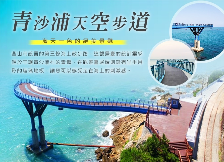 【青沙浦天空步道】位於連接海雲臺尾浦與松亭的東海南部線舊鐵路中間,距海平面高約20公尺,長約72.5公尺。這也是繼南區的「五六島Skywalk」 、西區的「松島Skywalk」之後,釜山市設置的第三條海上散步路。其設計靈感源於守護青沙浦村的青龍,在觀景臺尾端則設有呈半月形的玻璃地板,讓遊客可以感受走在海上的刺激感。而觀景臺正前方至青沙浦燈塔整齊並排的5個暗礁、青沙浦秀麗的海岸景觀,以及夢幻的日出、夕陽美景,是這裡最不容錯過的景色。到釜山旅遊,不妨就到青沙浦踏石觀景臺走走,欣賞令人心曠神怡的海景吧!