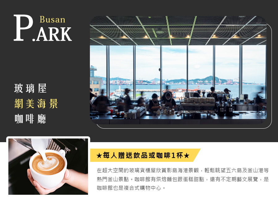 【P.ARK玻璃屋網美咖啡廳】位於釜山影島2021年5月全新開幕「P.ARK複合式文化空間」的海景玻璃屋網美咖啡廳,店內為階梯式座位讓旅客能從不同視角看海,還能自費品嚐每天現做10多種麵包與甜點搭咖啡。