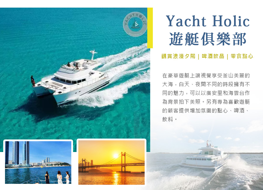 【Yacht Holic】是 2023 年新加入 Visit Busan Pass 的船家,主打精緻小團、船上提供免費的酒水點心、船家貼心的拍照服務,是不少人來釜山旅遊最值得的體驗之一。遊艇路線從海雲台的水營灣遊艇俱樂部出發,行經多個海雲台及廣安里景點,像海洋城市、The Bay 101、冬柏島、廣安大橋、廣安里海水浴場、民樂水邊公園、水營江等等,才開船不久,天空就開始變色,迎來到最期待的浪漫夕陽;船家會在夕陽時停靠在廣安大橋幾分鐘,讓想拍照的人輪流在船頭拍照,當夜色降臨,精彩的遊艇煙火秀即將上演,讓我們一起在船上渡過最浪漫的時光吧!