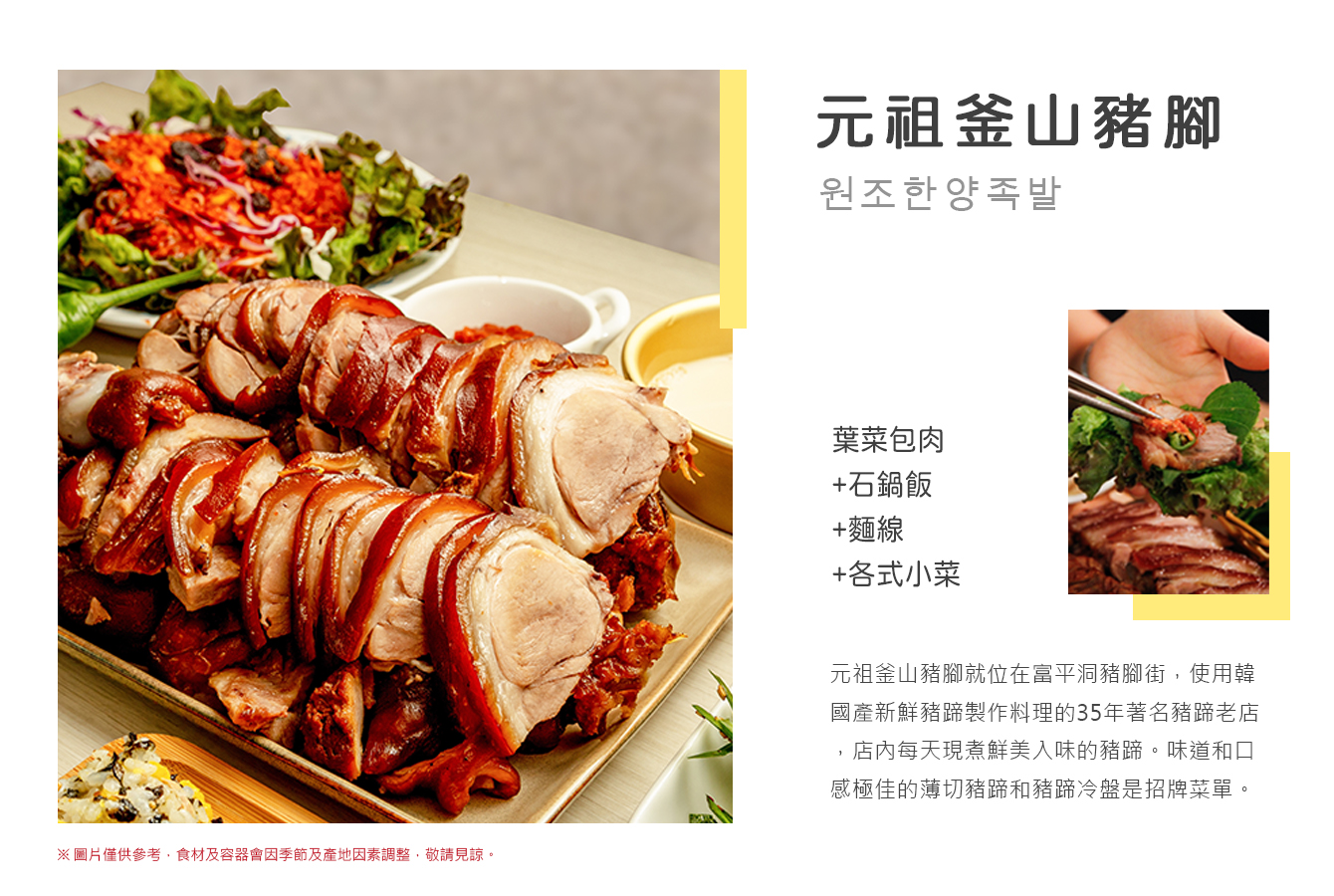 ◎ 元祖釜山豬腳(葉菜包肉 石鍋飯 麵線 各式小菜)