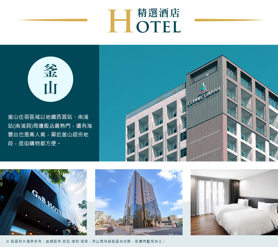 住宿:釜山Arban City Hotel (或) 釜⼭ GNB HOTEL BUSAN (或) 南浦洞Connect Busan Hotel (或) 釜山The King Hotel (或) 同級