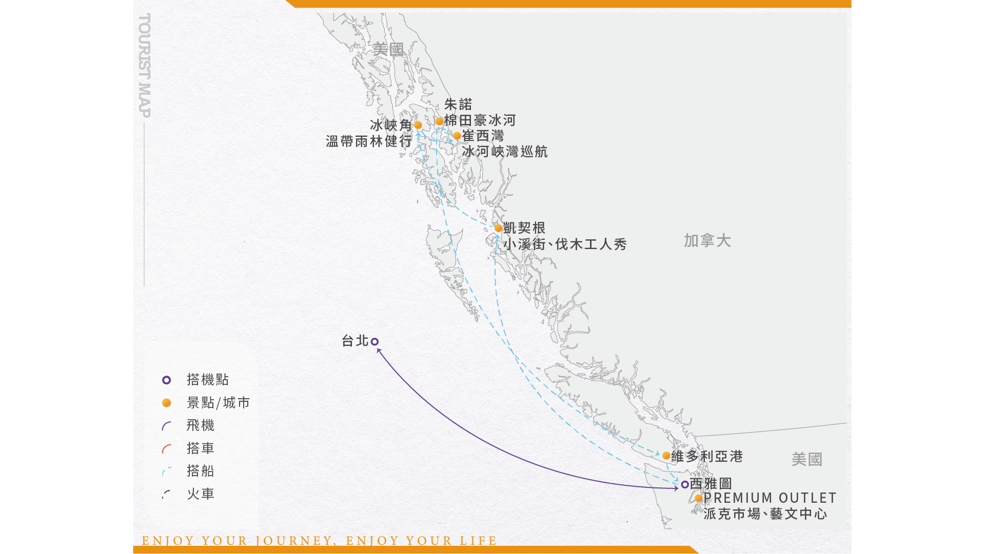 遊輪航行於阿拉斯加內灣航道(Inside Passage),沿著阿拉斯加東南部蜿蜒的峽灣與島嶼之間前進,海面平穩、景色壯麗。航程中可欣賞壯觀冰河、峽灣海岸與森林山景,停靠各具特色的當地小城,有機會看到鯨魚、海獅或白頭海鵰等野生動物,是結合自然奇景與地方文化的經典航線,一生必訪阿拉斯加。